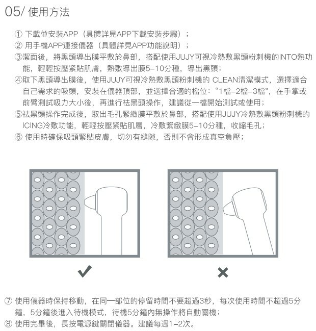 前臂測試吸力大小後,再進行祛黑頭操作,建議從一檔開始測試或使用;