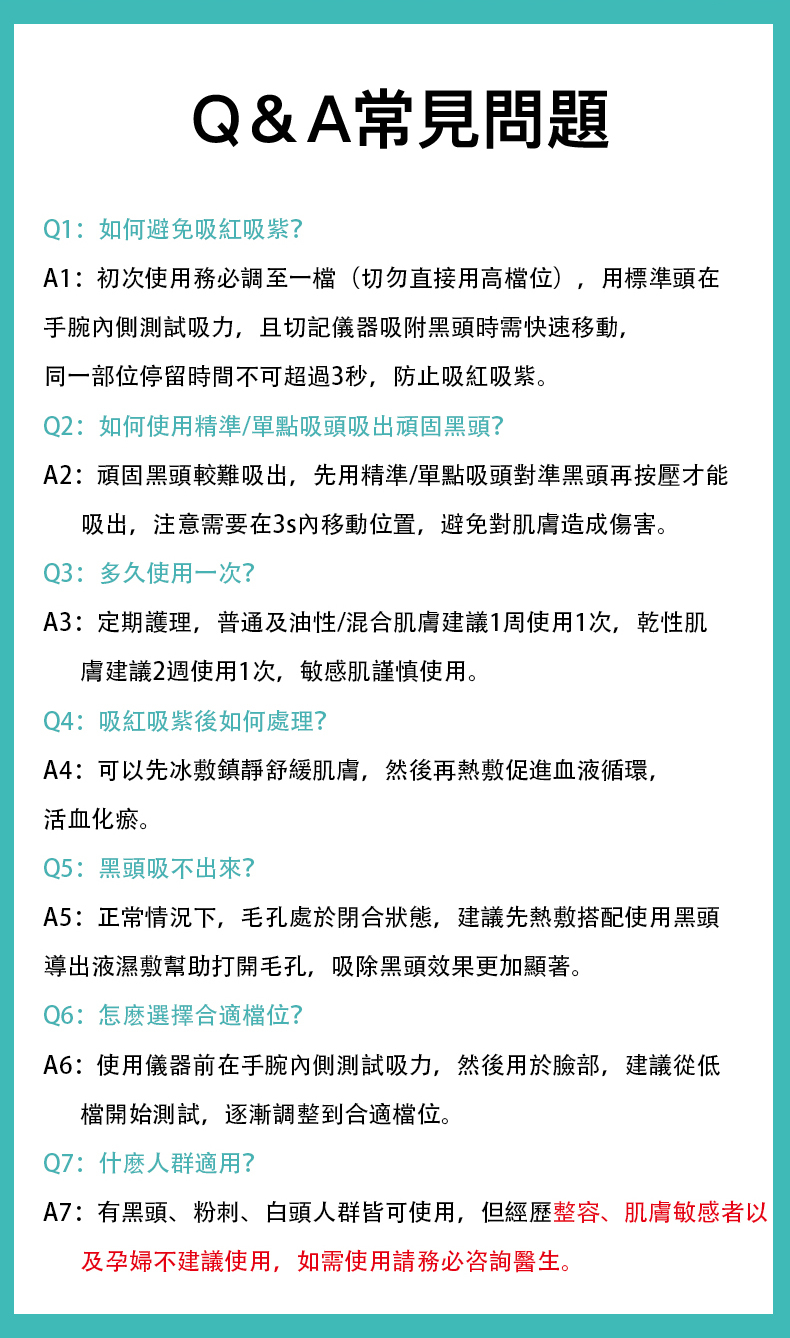 溫馨提示:建議每週使用1-2次,使用時確保吸頭緊貼皮膚,切勿有縫隙,否則不會形成真空負壓。黑頭導出液含果酸成分,請先在耳後塗抹測試,如有過敏現象,請停止使用,並用清水沖洗。